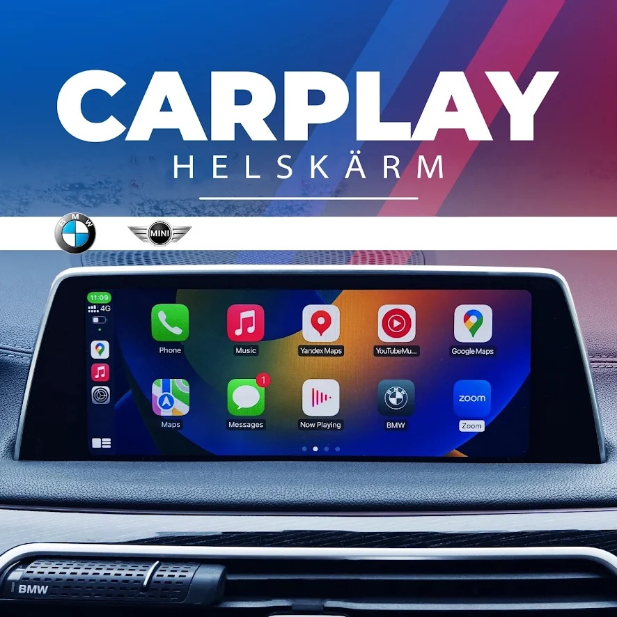 Aktivering av Apple CarPlay i helskärmsläge för BMW/MINI. Uppgraderingen låser upp trådlös CarPlay och möjliggör visning i fullskärm på bilens originalskärm. Snabb installation och fullt kompatibel med bilens befintliga system.